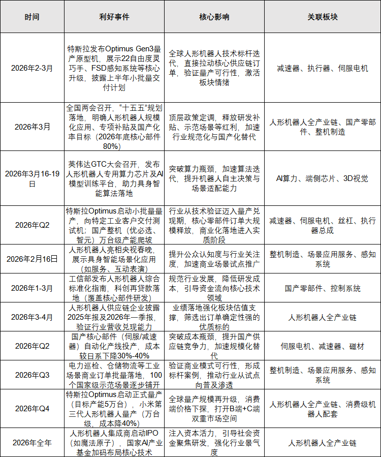 2026年人形机器人交易核心围绕“量产兑现 + 政策催化”展开,全年利好事件形成清晰时间催化线。