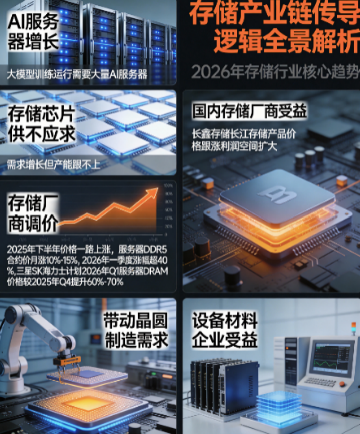 3. 存储厂商调价:供不应求的结果就是调价。2025年下半年以来,存储芯片价格一路上涨,服务器DDR5合约价月涨10%-15%,2026年一季度涨幅超40%。三星和SK海力士计划在2026年第一季度将服务器DRAM价格较2025年第四季度提升60%-70%。