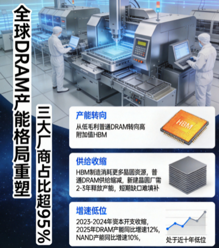 HBM制造消耗晶圆资源更多,直接缩减普通DRAM供给。同时,新建晶圆厂需要2-3年才能释放产能,短期缺口难以填补。2023-2024年行业资本开支收缩导致全球存储产能增速放缓,2025年DRAM产能同比增速仅12%,NAND产能同比增速10%,均处于近十年低位。