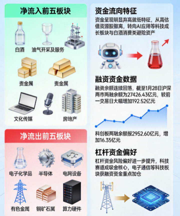 资金呈现明显"弃高就低"特征,从高估值资源股撤离,转向AI应用等科技成长板块与白酒消费类避险资产。