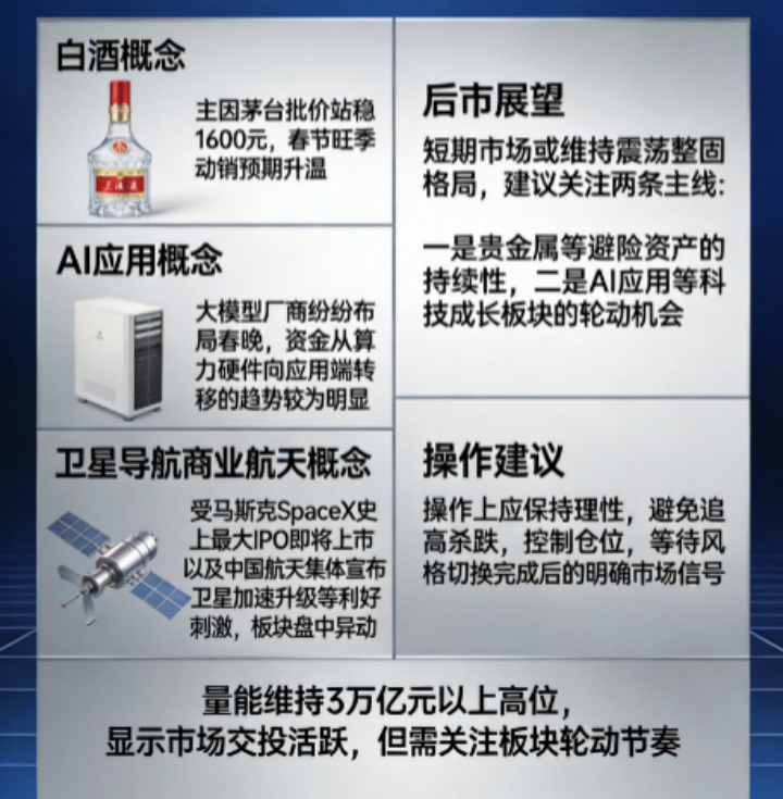 后市展望,短期市场或维持震荡整固格局,建议关注两条主线:一是贵金属等避险资产的持续性;二是AI应用等科技成长板块的轮动机会。操作上应保持理性,避免追高杀跌,控制仓位,等待风格切换完成后的明确市场信号。