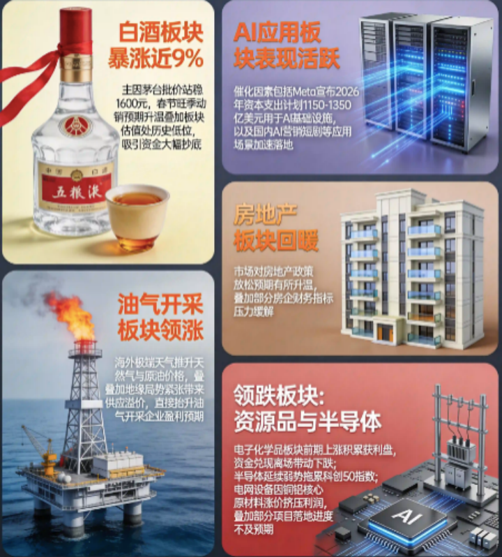 AI应用板块:表现活跃,催化因素包括Meta宣布2026年资本支出计划(1150-1350亿美元用于AI基础设施),以及国内AI营销、短剧等应用场景加速落地。