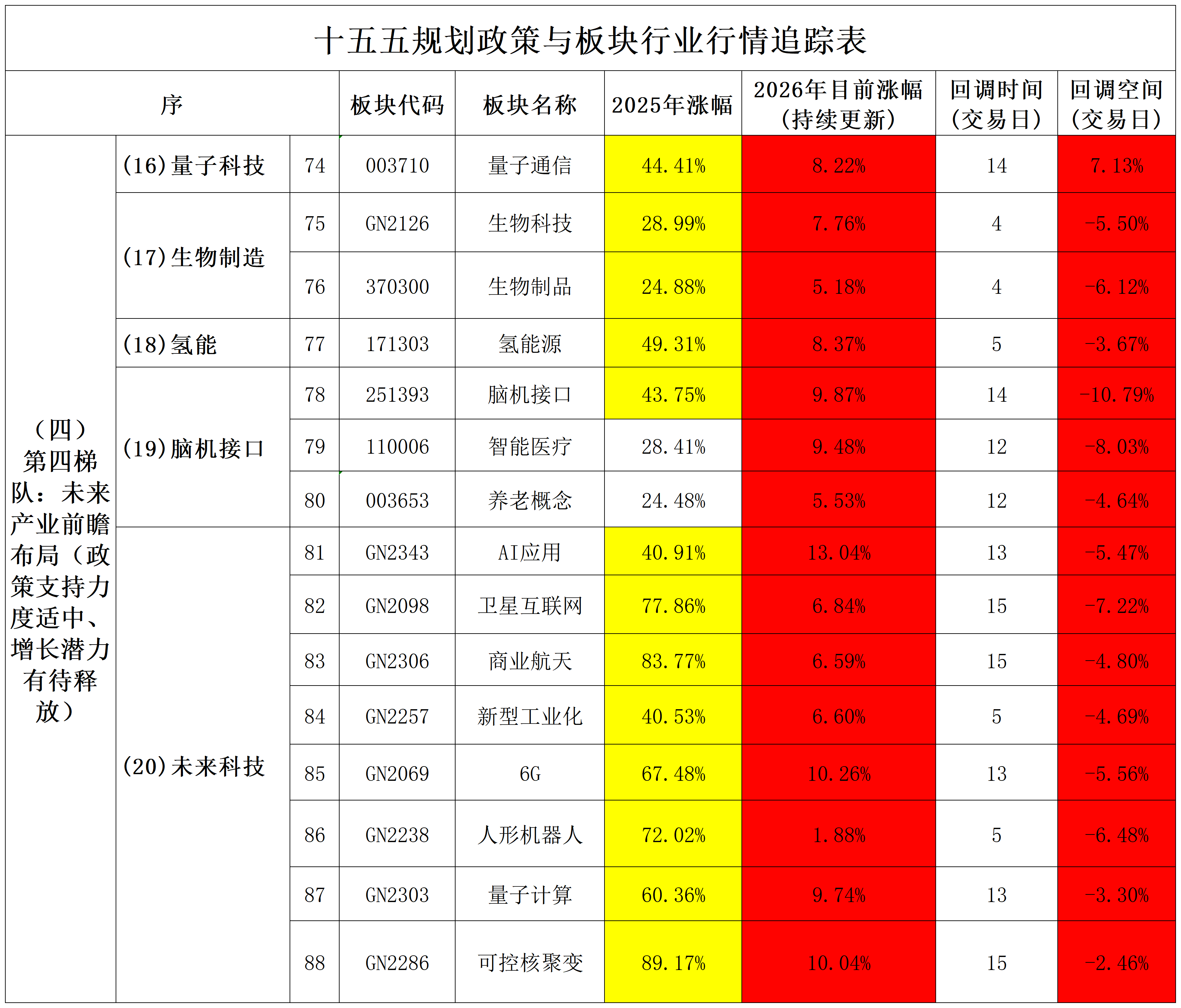板块分析(当日):商业航天:当前价位:2165.14;今日涨跌:-0.96%;2025年涨幅:83.77%;2026年目前涨幅:7.61%;近期高点:2444.08;回调时间:15;回调空间:-4.80%;板块分析:板块内部分化,政策利好(上海“火箭星城”)提振部分标的,但多数个股回调。