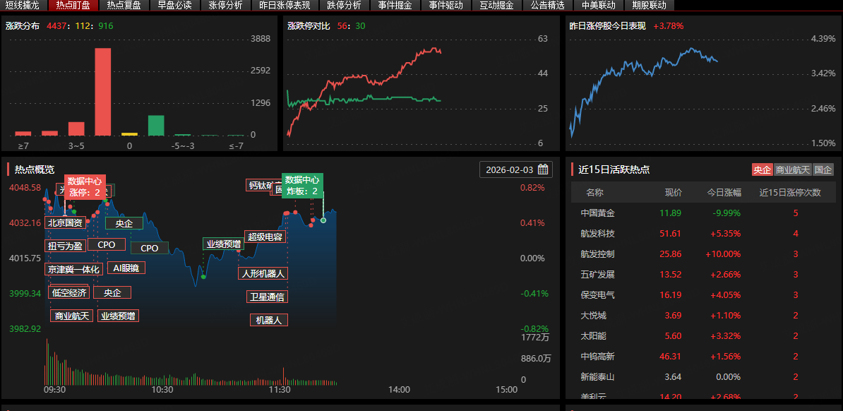 2026/2/3 13:29:482026年2月3日A股以结构性修复为主,上午沪指半日收涨0.38%,主线集中在光伏、商业航天、算力等成长赛道,贵金属、半导体等板块延续调整。下午大概率呈高位震荡整理,沪指核心波动区间4030-4050点,需重点盯量能与主线持续性,做好高抛低吸。