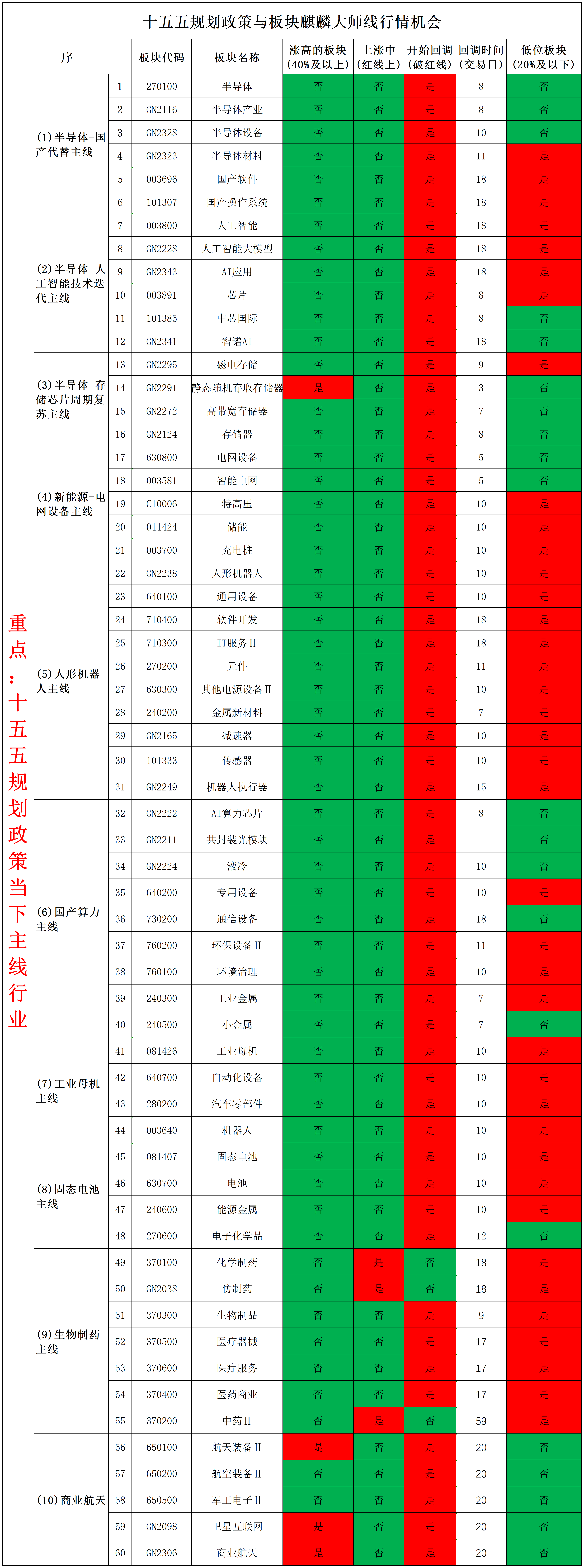 • 开始回调板块(破红线):57个,占比95.0%,覆盖所有核心赛道