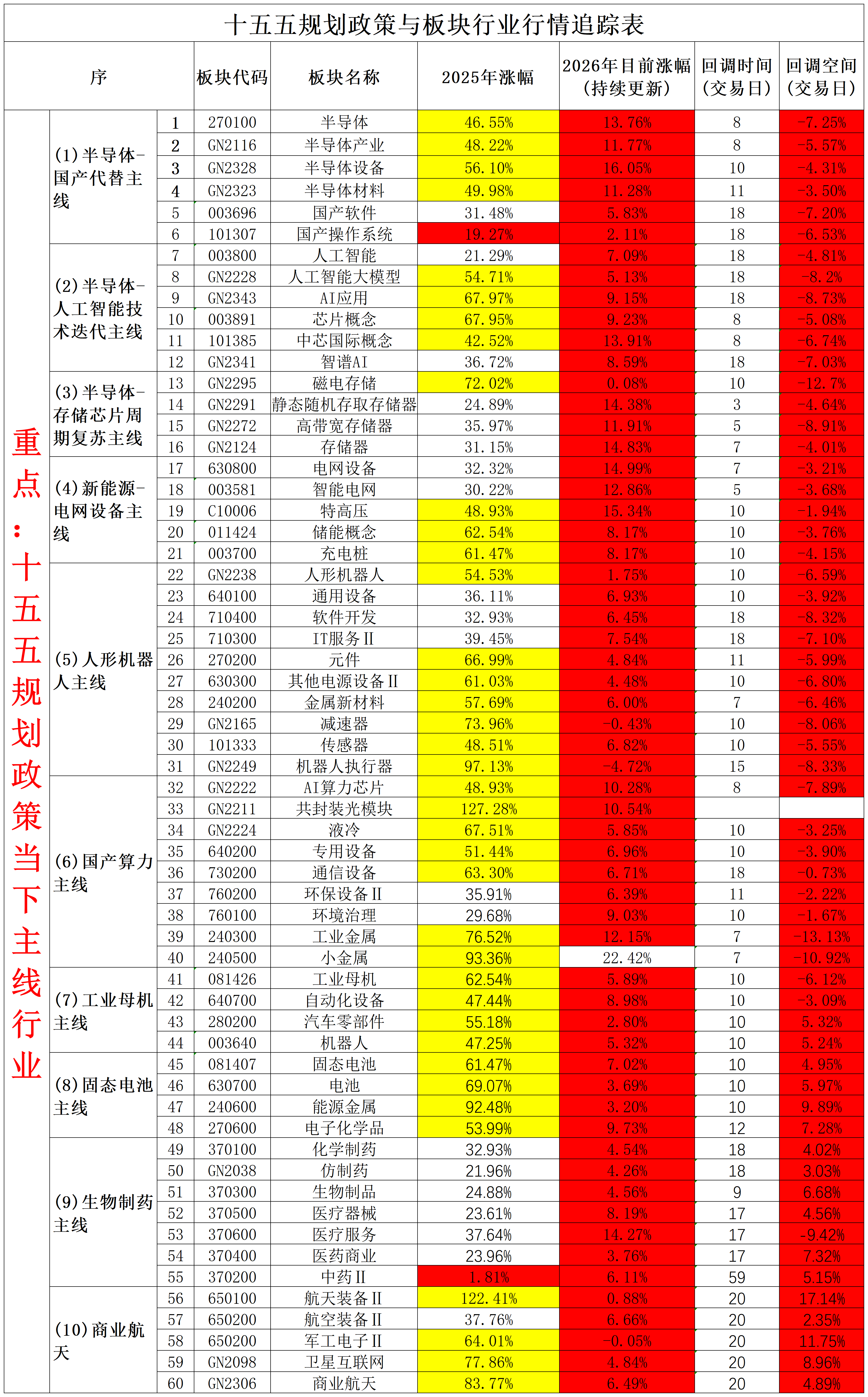 特点分析: 覆盖范围最广,几乎包含所有十五五规划核心赛道(半导体、AI、新能源、机器人、医药等)。当前整体处于调整阶段,主要原因包括前期涨幅较大后的获利回吐、市场风格切换等。对于此类板块,需结合回调时间长度、估值水平和行业基本面综合判断,调整充分的板块可能存在布局机会。