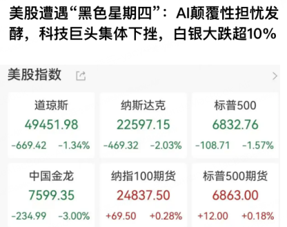 美股三大指数震荡走弱并集体大跌,道琼斯工业平均指数跌1.34%收于49451.98点,纳斯达克综指跌2.03%收于22597.15点,标普500指数跌1.57%收于6832.76点;板块方面科技股领跌,仅存储芯片板块逆势上涨;中概股同样普跌。