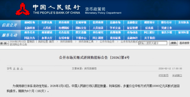 2月12日晚间,央行重磅发布公告,宣布将于2月13日开展10000亿元6个月期买断式逆回购操作,操作以固定利率、数量招标方式进行。本次操作有5000亿元同期限逆回购到期,实际净投放中长期资金5000亿元。叠加月初8000亿元3个月期操作,2月累计净投放达到6000亿元,是近半年来春节前最大规模的中期流动性补给。