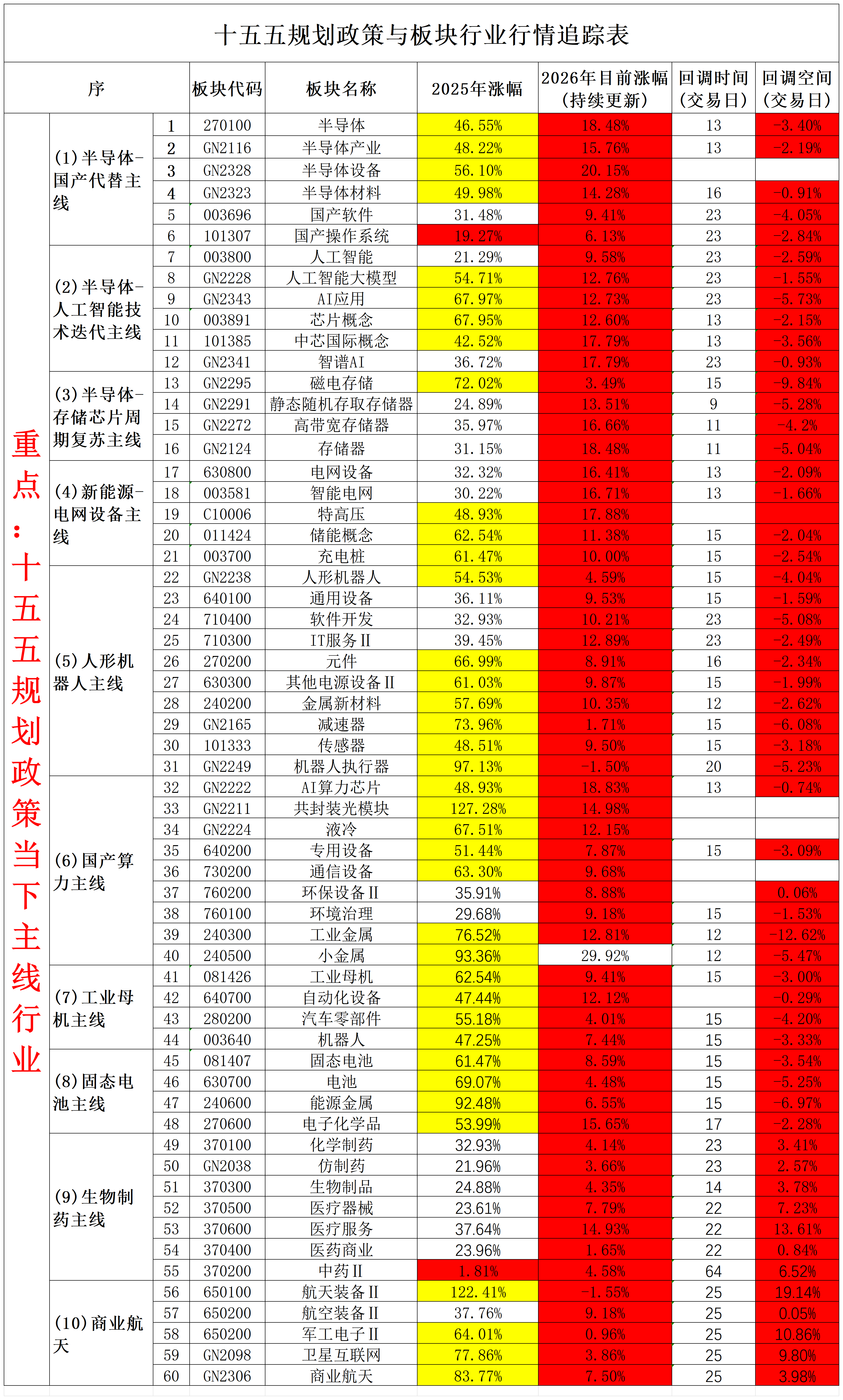 2026年2月13日十五五规划政策与板块行业行情追踪表