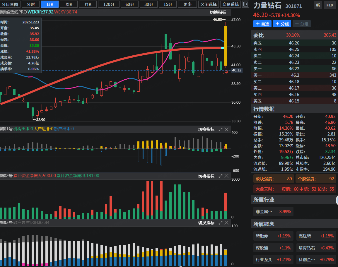 核心逻辑:行业高成长预期。市场消息面上,一份行业报告预测中国培育钻石市场规模到2030年将超过千亿 。这一远期巨大市场空间直接点燃了板块情绪,带动力量钻石等个股强势上涨 。