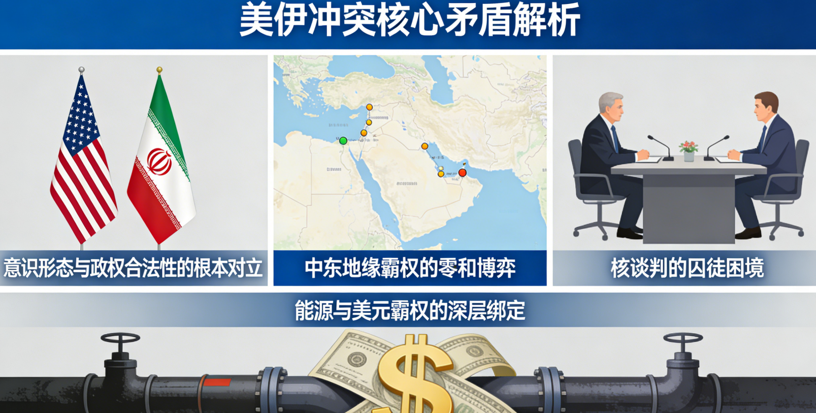 伊朗现政府的存在削弱了美国在中东的军事霸权和石油美元霸权。美国要维持中东主导权,必须遏制伊朗的地区影响力扩张,绝不可能在谈判中放弃,双方在地缘格局上是完全的零和博弈。