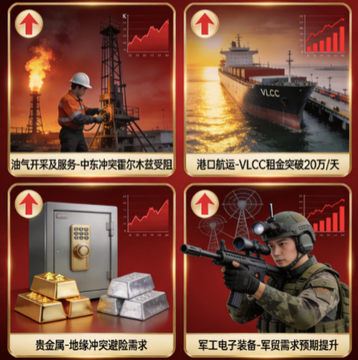 板块方面,地缘政治突发事件成为市场核心驱动力。油气开采及服务、港口航运、贵金属、军工电子、军工装备板块集体大涨,部分科技概念表现活跃,显示资金在避险的同时,依然看好科技成长板块的中长期投资价值。事件驱动方面,美以空袭伊朗,霍尔木兹海峡航运中断,中东地缘政治局势急剧恶化。