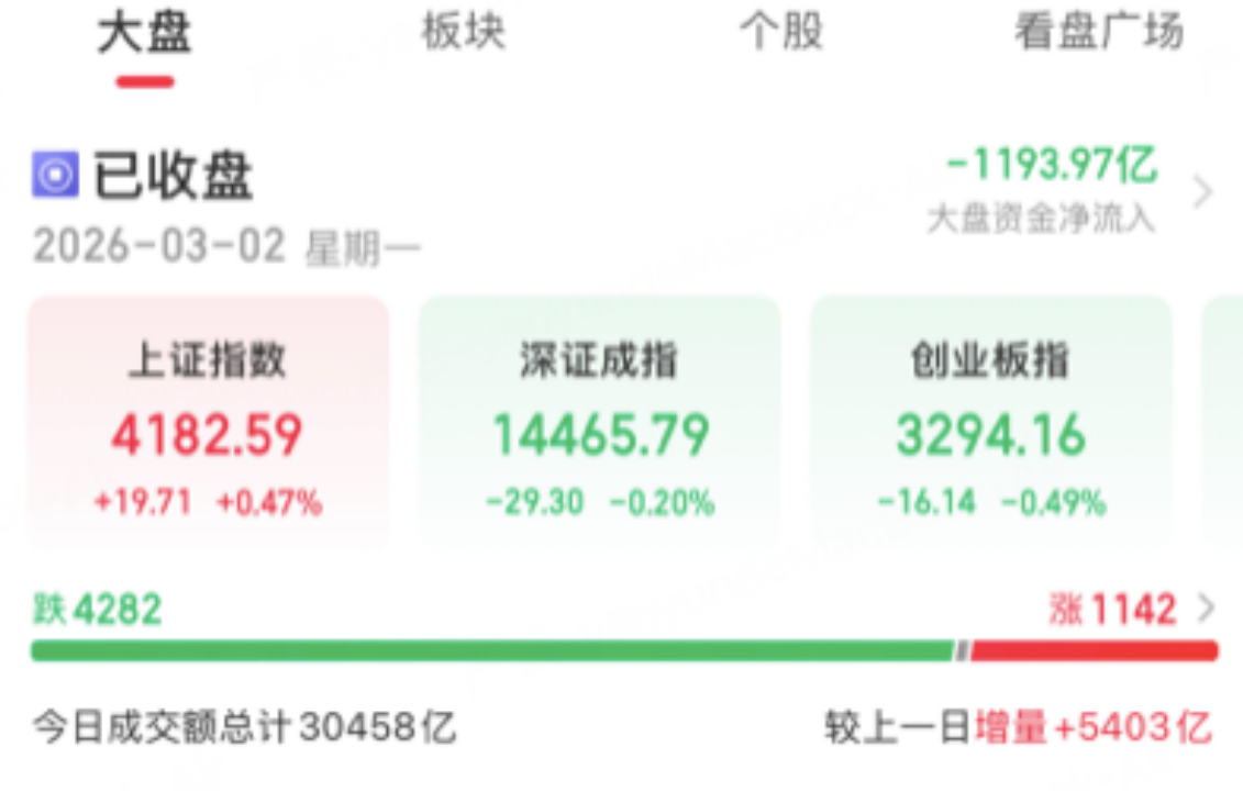 市场情绪:沪深京三市成交额30458亿元,较上日放量5403亿元;三市超4200只个股下跌。量能大幅放大至3.04万亿元的高位水平,显示市场交投活跃,资金大规模调仓换股。地缘政治突发事件引发恐慌情绪,大量资金从高位成长板块撤离,加速向资源、军工等避险板块集中,市场呈现出明显的"强者恒强、弱者恒弱"特征。