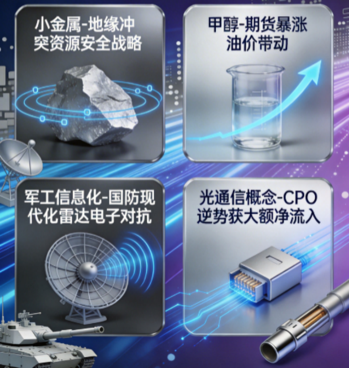 主力资金呈现鲜明的"避险+科技成长"双线流入特征。在市场恐慌情绪加剧、大量个股下跌的背景下,共封装光学(CPO)、F5G、高压快充等科技概念逆势获大额净流入,显示资金在避险的同时,依然看好科技成长板块的中长期投资价值,显示出逢低布局优质科技股的意愿。