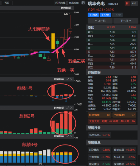在3月5日,股价涨停上穿麒麟线,出现了五绝形态中的大阳穿麒麟线形态,麒麟趋势线翻红,且麒麟1号2号3号均为红柱,符合资金验证的麒麟三红。