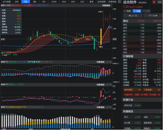其中远光软件股价从25年12月17日阶段波段见低点5.86以来,开启震荡向上行情,期间有2个向上拐点K线和1个爆点长阳K线形态,短期有创阶段新高,实现三期共振向上;板块强度41个股强度93;结合麒麟指标6号连续红柱,表明得到主力资金的认同且实现高度控盘特征;3号显示机构持仓比例6成;4号显示超资频繁流入;盘后预选内参案例作为教学分享演练,不做直接推荐,同时新手建议学习为主。
