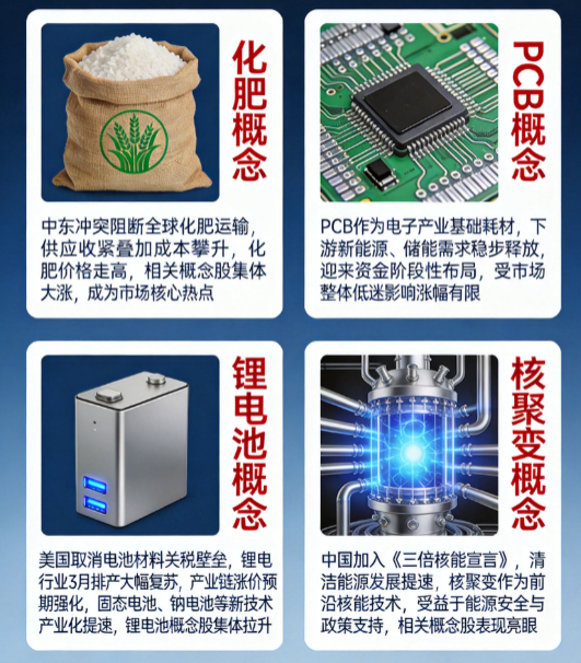 1. 化肥概念:供应链扰动+涨价预期:中东冲突阻断全球化肥运输,供应收紧叠加成本攀升,化肥价格走高,相关概念股集体大涨,成为市场核心热点。