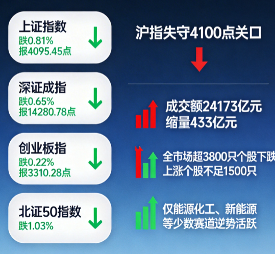 指数表现:A股三大指数今日集体震荡下行,尾盘跌幅有所扩大,截至收盘,上证指数跌0.81%,报4095.45点;深证成指跌0.65%,报14280.78点;创业板指跌0.22%,报3310.28点;北证50指数跌1.03%,领跌主要宽基指数,沪指失守4100点关口,市场整体走势偏弱。