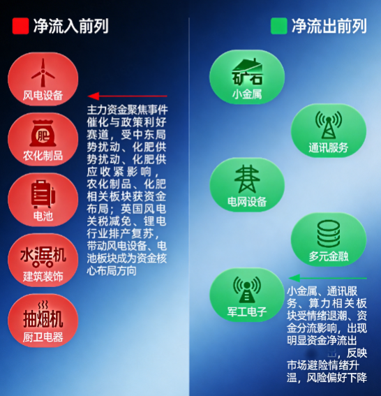 主力资金聚焦事件催化与政策利好赛道,受中东局势扰动、化肥供应收紧影响,农化制品、化肥相关板块获资金布局;英国风电关税减免、锂电行业排产复苏,带动风电设备、电池板块成为资金核心布局方向;而小金属、通讯服务、算力相关板块受情绪退潮、资金分流影响,出现明显资金净流出,反映市场避险情绪升温,风险偏好下降。
