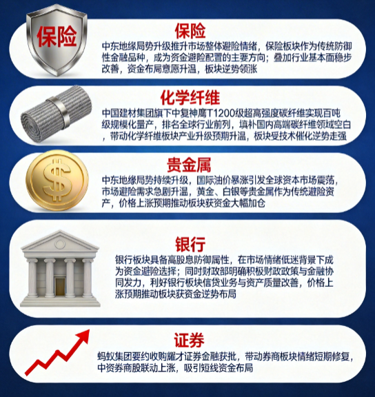 1. 保险:避险需求+估值低位:中东地缘局势升级推升市场整体避险情绪,保险板块作为传统防御性金融品种,成为资金避险配置的主要方向;叠加行业基本面稳步改善,资金布局意愿升温,板块逆势领涨。