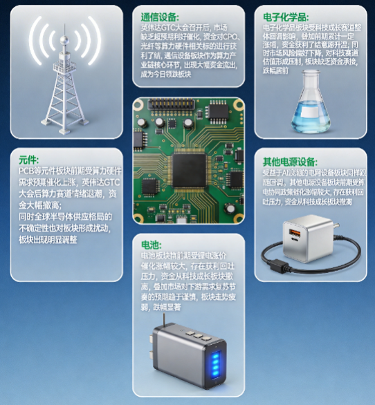 4. 其他电源设备:赛道轮动+资金分流:受益于AI浪潮的电网设备板块同样跟随回调。其他电源设备板块前期受"算电协同"政策催化涨幅较大,存在获利回吐压力,资金从科技成长板块撤离。