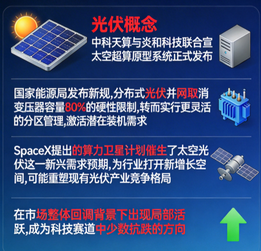 1.光伏概念:消息催化+局部活跃:近日,中科天算与炎和科技联合宣布,太空超算原型系统正式发布。据国家能源局发布的新规,分布式光伏并网取消变压器容量80%的硬性限制,转而实行更灵活的分区管理,激活了潜在装机需求。其次,行业内部整合持续推进。SpaceX提出的算力卫星计划催生了太空光伏这一新兴需求预期,为行业打开了新的增长空间,可能重塑现有光伏产业竞争格局。在市场整体回调背景下出现局部活跃,成为科技赛道中少数抗跌的方向。