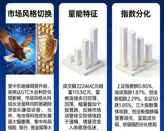 1. 市场风格切换:受中东地缘局势升级、英伟达GTC大会利好兑现影响,市场风格从“科技成长”全面转向“防御避险”,资金从通信设备、元件、电池等科技成长赛道大幅撤离,集中布局保险、银行、贵金属、钢铁等大金融与周期防御板块,化学纤维受技术突破支撑成为少数科技类逆势方向,市场呈现“防御为主、科技普跌”的特征。