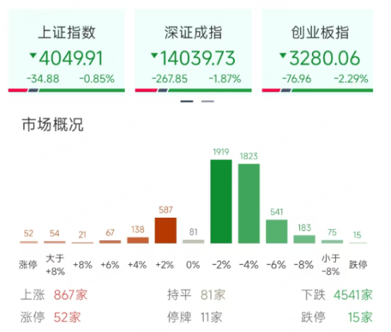 指数表现:A股三大指数今日集体走弱,呈现高开低走态势,上证指数跌0.85%,报4051.12点;深成指跌1.87%,报14022.35点;创业板指跌2.29%,报3223.56点,在主要宽基指数中领跌;北证50指数跌1.85%,各大指数午后跌幅均出现明显扩大,市场整体走势疲弱。
