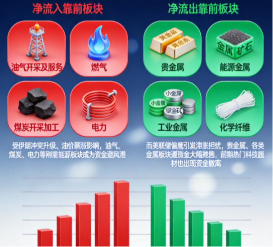主力资金呈现清晰的“避险抱团能源”配置特征,受伊朗冲突升级、油价暴涨影响,油气、煤炭、电力等刚需能源板块成为资金避风港;而美联储偏鹰引发滞胀担忧,贵金属、各类金属板块遭资金大幅抛售,前期热门科技题材也出现资金撤离,调仓方向紧扣地缘避险主线。