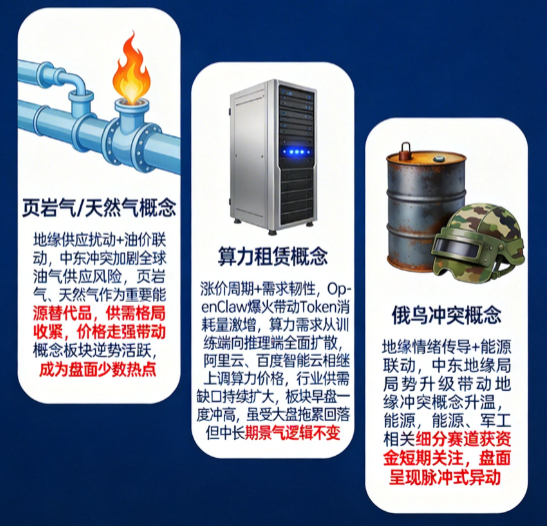 1. 页岩气/天然气概念:地缘供应扰动+油价联动:中东冲突加剧全球油气供应风险,页岩气、天然气作为重要能源替代品,供需格局收紧,价格走强带动概念板块逆势活跃,成为盘面少数热点。