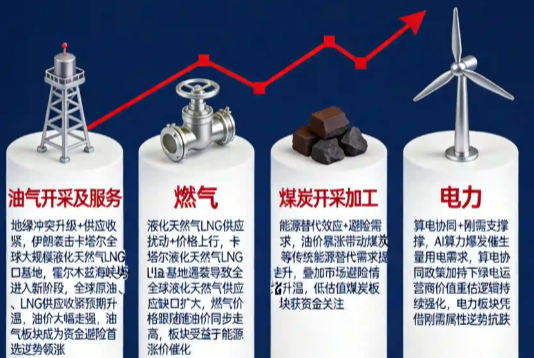 1. 市场风格切换:市场风格从前期科技成长全面转向避险防御,资金从贵金属、有色金属、科技成长赛道大幅撤离,集中抱团油气、煤炭、电力等能源刚需板块,避险情绪成为主导盘面的核心因素。