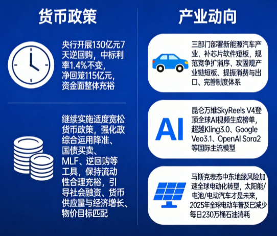央行召开扩大会议,明确继续实施好适度宽松的货币政策,核心围绕稳增长、稳物价发力,统筹增量与存量政策、货币与财政政策协同效应。会议提出,综合运用降准、国债买卖、MLF、逆回购等工具,保持流动性合理充裕;引导社会融资、货币供应量与经济增长、物价目标匹配;动态调控利率水平,压降综合融资成本,为实体经济复苏提供稳定货币环境。