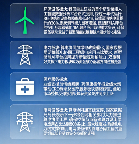 2. 电力:算电协同+绿电政策催化:国家数据局明确算电协同工程绿电应用占比要求,新型储能AI平台投用提升新能源消纳能力,双重利好共振下,电力板块成为资金核心配置方向,逆势走强。