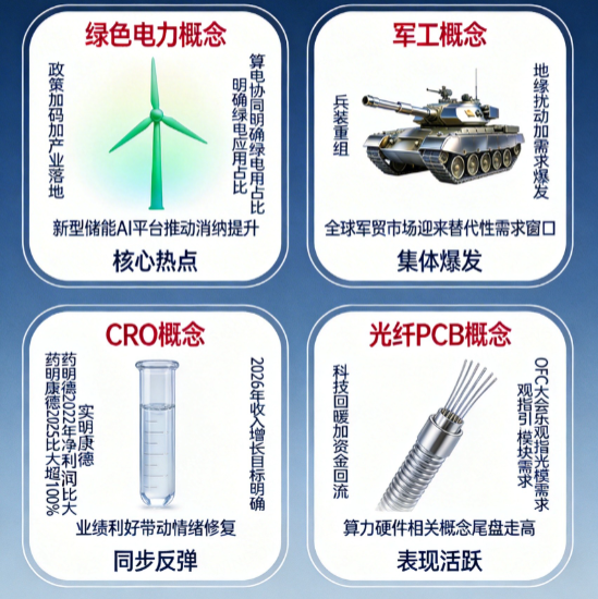 1. 绿色电力概念:政策加码+产业落地:算电协同政策明确绿电应用占比,新型储能AI平台投用推动绿电消纳提升,双重催化下概念板块全面走强,成为今日核心热点。