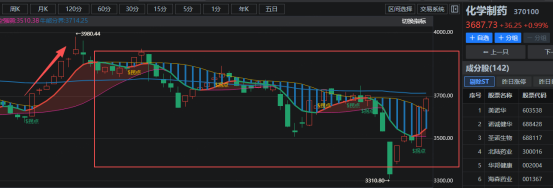根据咱们麒麟趋势交易系,可以发现【化学制药】板块在这一轮大盘深度调整的情况下,率先强势反弹。当前化学制药板块指数来到3687.73点位,已反弹至调整的位置,基本上是收复了因大盘深度调整的失地。