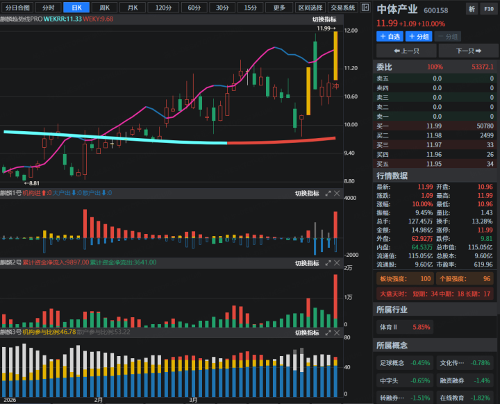 新一届“苏超”将于4月11日开赛,中体产业是国家体育总局实控的 A 股唯一体育产业平台。主营赛事运营、彩票设备与印制、场馆运营、体育培训,体育主业占比超 94%。2025 年因地产减值预亏 1.5-2.2 亿,体育业务稳健;近期受体育板块催化,股价强势涨停。