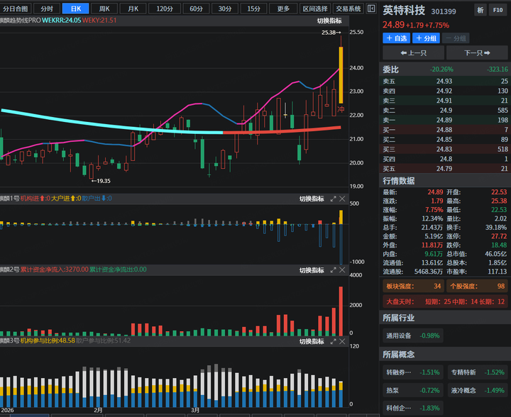 其中目前走势实现形成日线月线共振,市场环境虽然出现反弹,但上方压力依旧较大,仓位上要做好控制,结合我们五绝一买战法要求,麒麟指标1号2号主力控盘 ,得到市场资金的认同;3号显示机构持仓比例增加。盘后预选内参案例作为教学分享演练,不做直接推荐,同时新手建议学习为主。