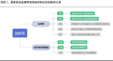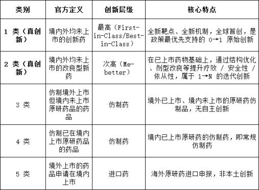 国家药监局将创新药分为化学药和治疗用生物制品两大主线,其中绿色标注的1类、2类为真正意义上的“创新药”,灰色 3-5 类为仿制药/进口药,仅作区分。