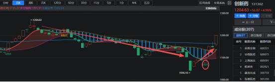 根据咱们麒麟趋势交易系,可以发现【创新药】板块在这一轮大盘深度调整的情况下,率先企稳强势反弹,今天继续全面爆发,全面收复前期回调失地,创新药板块指数来到1204.63点位。