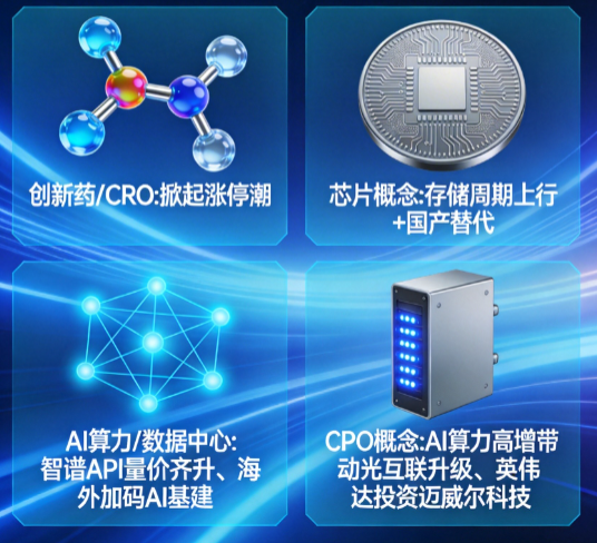 1. 创新药/CRO:行业政策、产业数据、国际事件三重催化集中落地,板块掀涨停潮,防御与成长属性双重凸显,成为资金抱团核心方向。