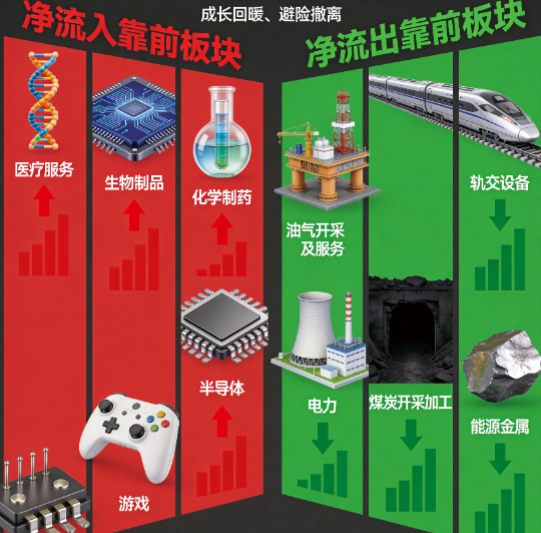 • 净流入靠前板块:医疗服务、生物制品、化学制药、半导体、游戏、元件