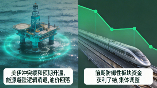 1. 煤炭/油气/能源金属:美伊冲突缓和预期持续升温,中东地缘风险显著下降,能源避险逻辑消退,叠加国际油价短线回落,板块全线走弱,成为全天跌幅居前的方向。