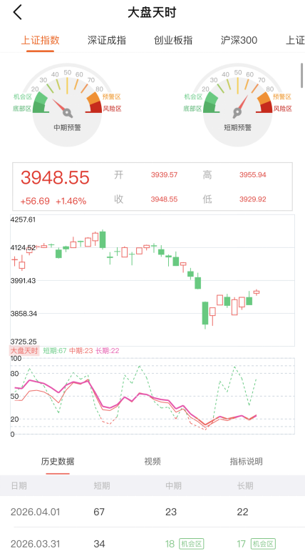 天时短线指标从34跃升到67,短线情绪显著回暖。中期指标从18涨到23,长期指标从17回到22,三大指标集体回暖拐头向上。市场整体情绪得到修复。随着四月开门红行情落地,市场整体情绪得到修复,但我们还要观察一下持续性才能确认修复。