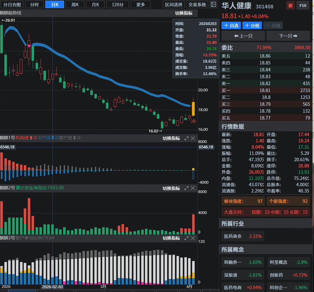 属于板块补涨逻辑。今日午后医药产业链持续走强,资金从早盘的创新药扩散至医药商业细分领域,带动华人健康上涨。其上涨主要源于板块热度的传导。