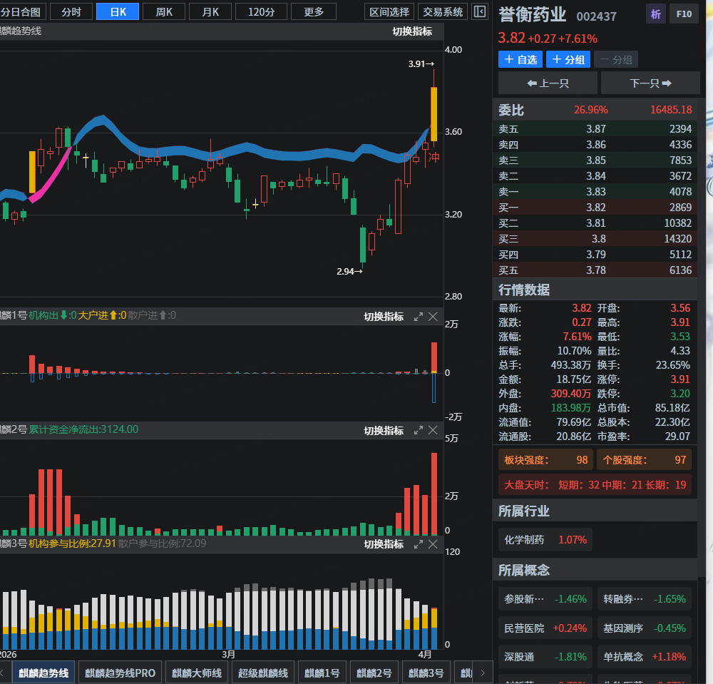 2、盘后策略内参需要进行盘中确认,算法要满足条件,股票也需要在【主图麒麟趋势线PRO+麒麟1号+2号+3号】体系之内,并符合战法规则!