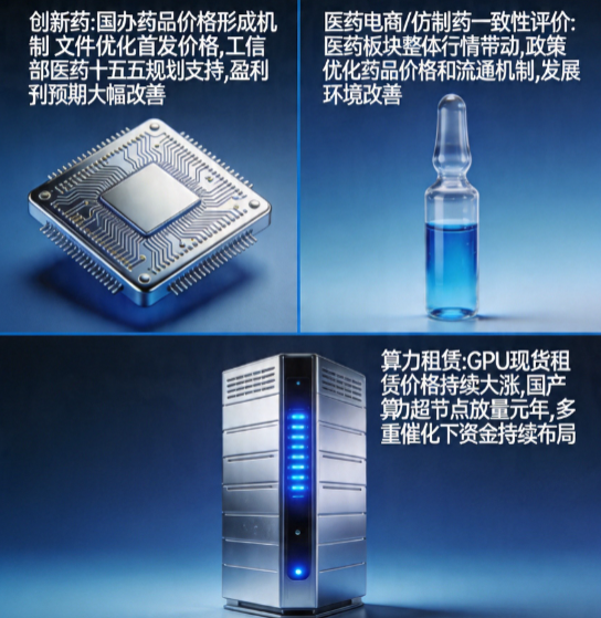 1. 创新药:核心催化就是国办印发的药品价格形成机制文件,优化创新药首发价格,给了行业长期稳定的政策预期,加上工信部医药“十五五”规划的支持,创新药企业的盈利预期大幅改善,相关个股集体走强。