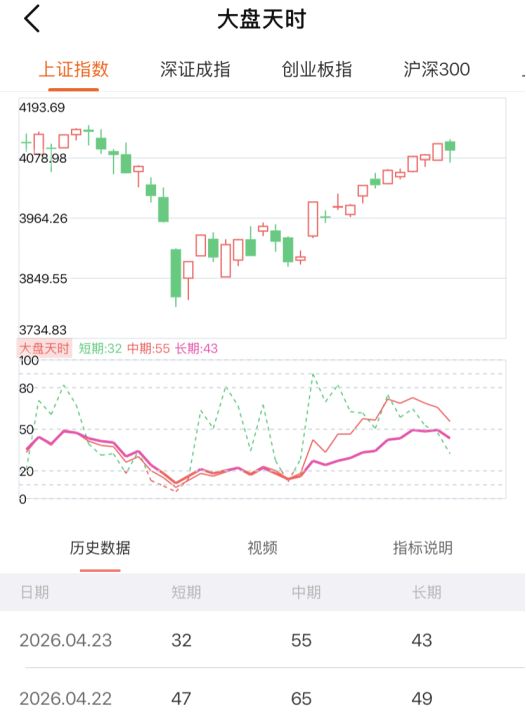 从天时指标来看,短中长三大指标全线同步回落:短线指标从 47 回落至 32,短期做多情绪快速退潮,市场进入震荡调整阶段;中期指标从 65 回落至 55,中期上行节奏明显放缓,支撑力度减弱;长期指标从 49 回落至 43,结束此前稳步抬升态势,中长期底部支撑有所松动。