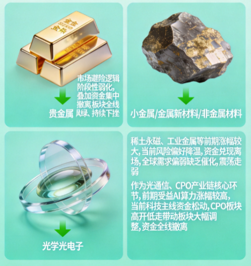 催化逻辑:稀土永磁、工业金属等小金属板块前期受益 AI、新能源催化涨幅较大,当前市场风险偏好降温,资金集中兑现离场;同时全球需求预期偏弱,板块缺乏新增催化,震荡走弱。