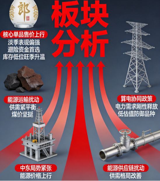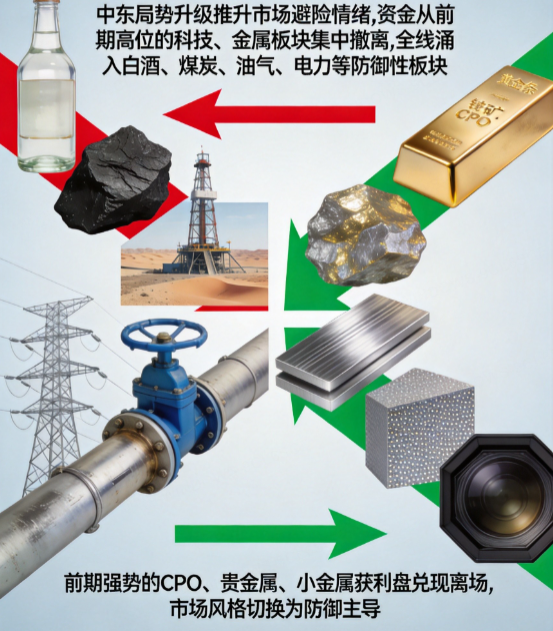 中东局势升级推升市场避险情绪,资金从前期高位的科技、金属板块集中撤离,全线涌入白酒、煤炭、油气、电力等防御性板块;前期强势的 CPO、贵金属、小金属获利盘兑现离场,市场风格切换为防御主导。