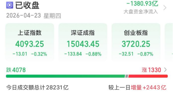 4月23日A股复盘:三大指数高开低走,消费能源护盘,科技赛道集体回调